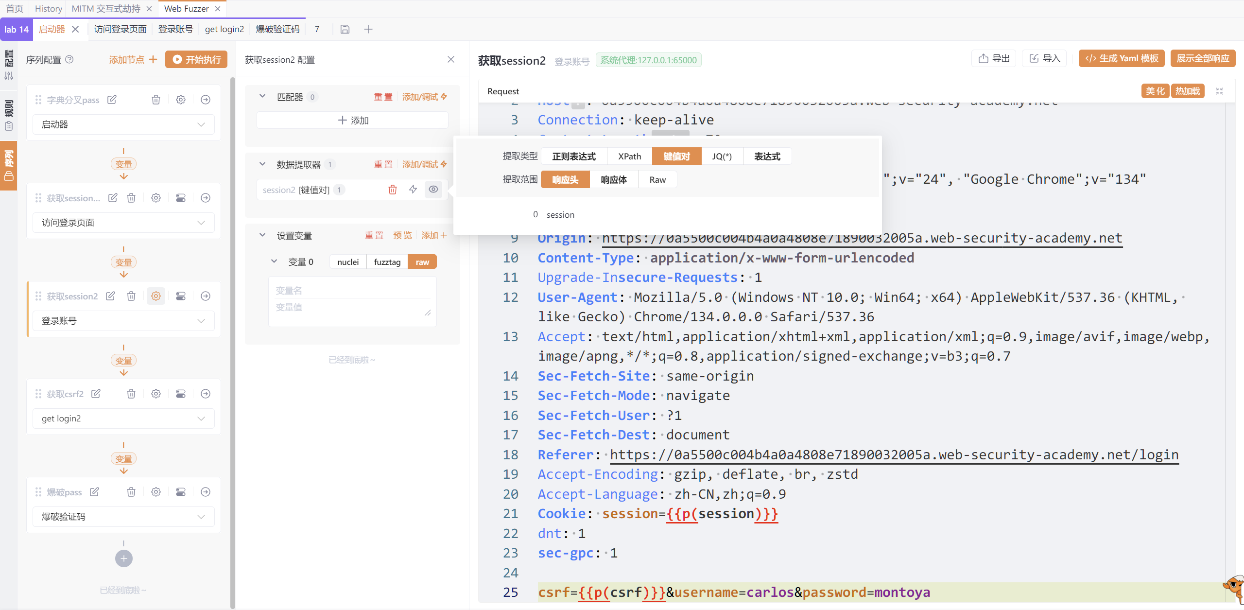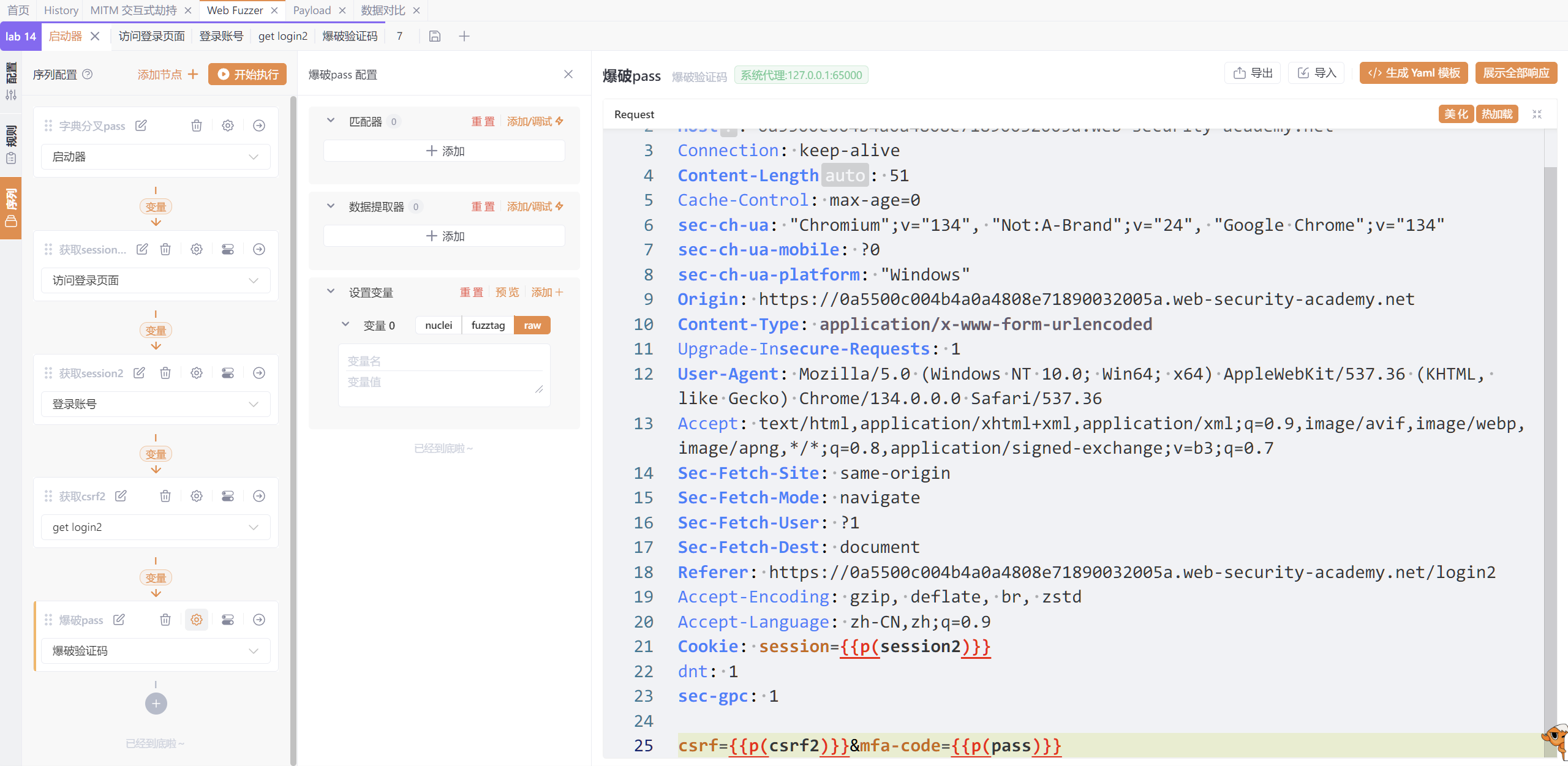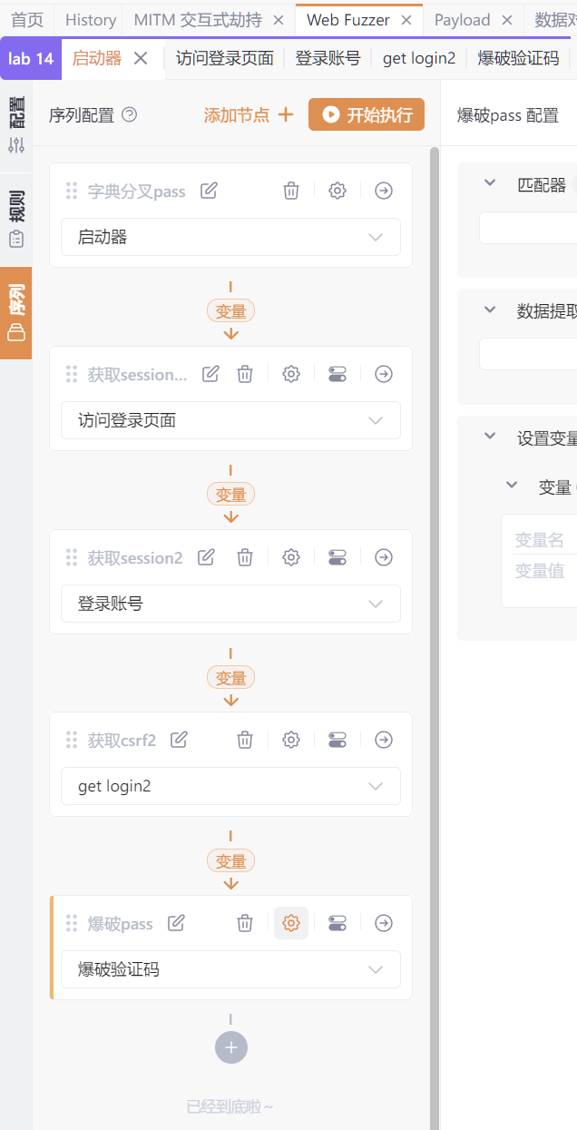 把新的session和csrf填进去,爆破一个验证码。由于第一个启动器会不断从字典中取值发包,所以这边流程走完也就能慢慢爆破完验证码