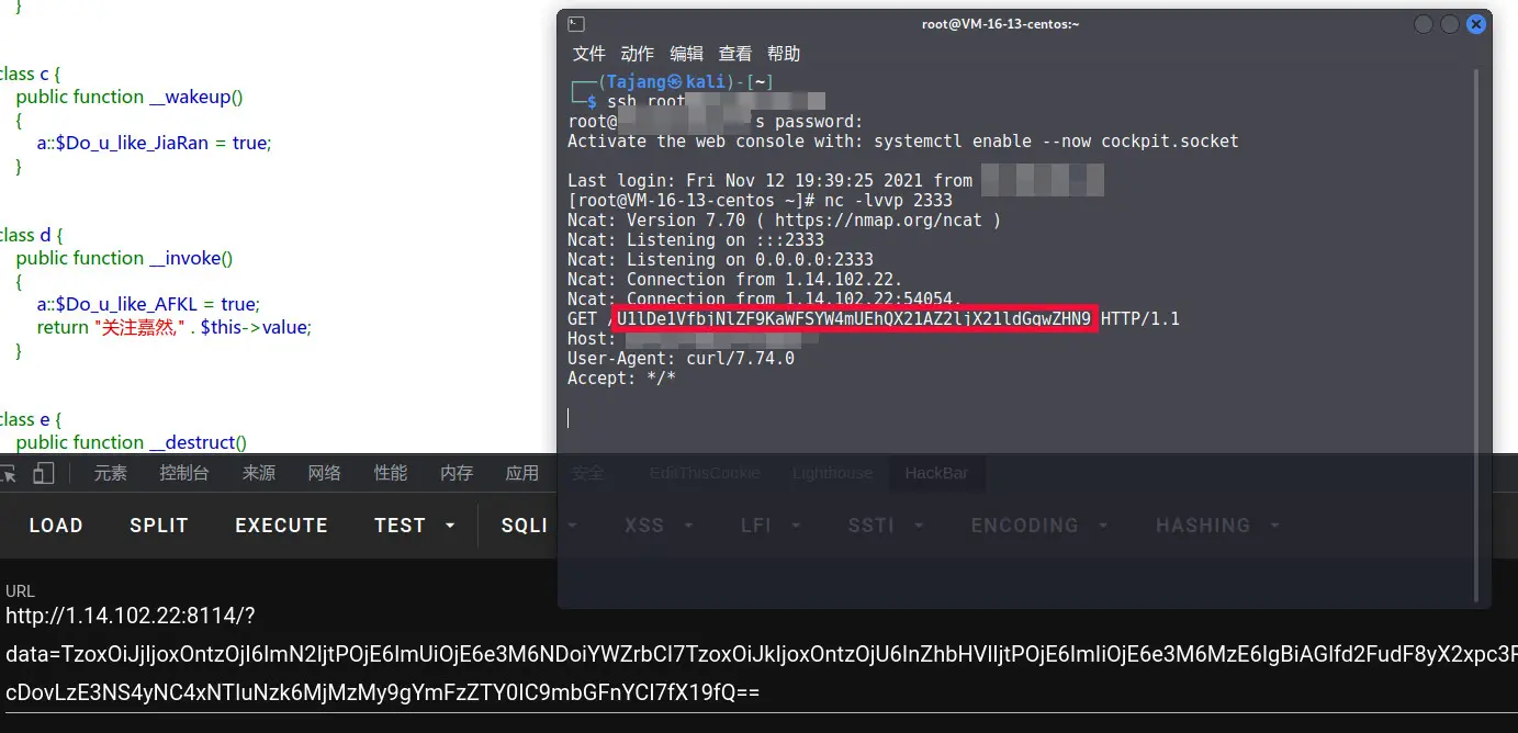 调用exec,就要a::$Do_u_like_AFKL=true,全局中只有利用d类的invoke才行,调用toString需要把对象当作字符串用,刚好也在invoke里,如何调用invoke?e类的destruct就可以了,我之前是如何调用destruct的呢?我通常把这个类对象复制一份,再把原先那个unset,序列化原对象的副本就好了,但这个方法一般只适用于destruct为链子第一段,但这题不一样,需要满足里面的if语句,欲使a::$Do_u_like_JiaRan=true就要经过c类的wakeup,这里我刚开始就不会了。c怎么和e连起来?