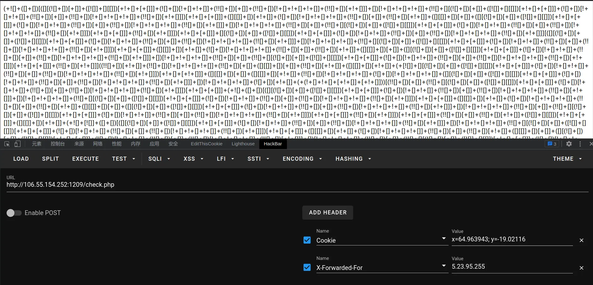 很明显了,index.php传url,好像也没ban什么,这里采用gopher最强协议修改成绩,但在这之前我们需要知道内网的主机有哪些,可以爆破,但我这里查看/proc/net/arp和/etc/hosts两个文件。