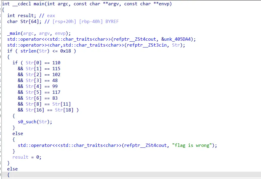 伪代码大致就是满足if里的条件进入s0_such(Str)里,跟进去