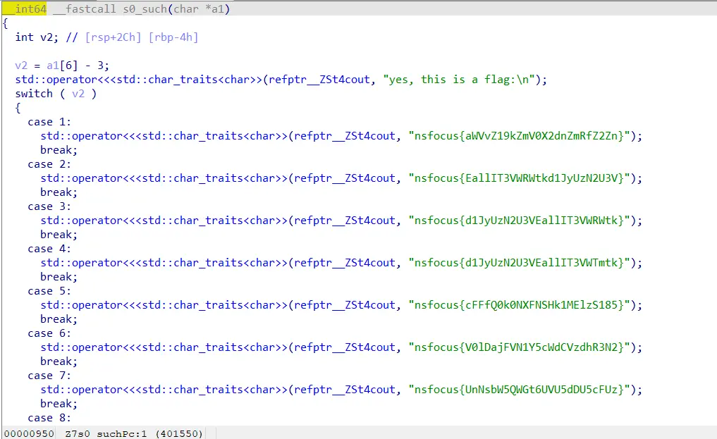 近百条case语句,真的flag应该是其中某一条,这里的switch里是v2,我们看到v2=a1[6]-3,刚才的伪代码里str[6]=83,所以这里v2为80,flag里base64解码