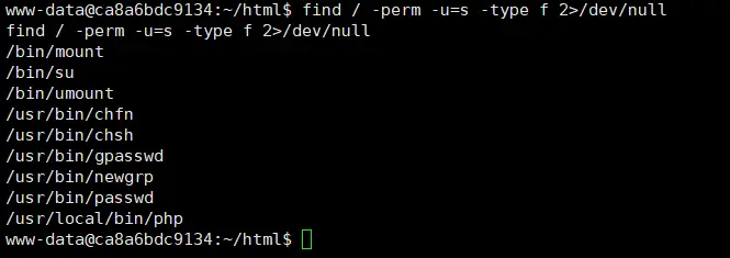 成功反弹shell,因为没有权限的原因,所以我们仍然无法读取flag,这里我们需要提权,最常见的就是suid提权,使用find / -perm -u=s -type f 2>/dev/null查看具有suid权限的文件,这个要等一会才能出来。
