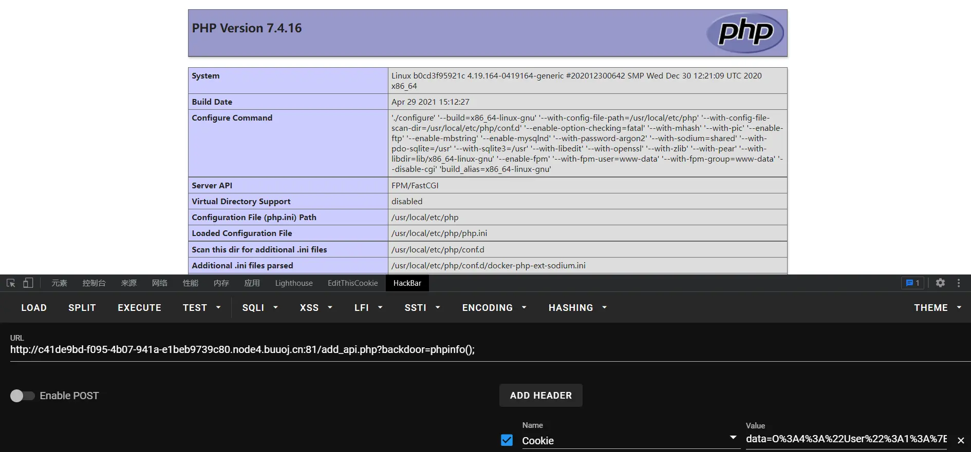 进入shell后,看到根目录底下是有flag的,可是没有读取权限,这个时候我们访问phpinfo查看相关配置信息,hackbar传就可以看了