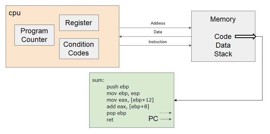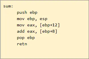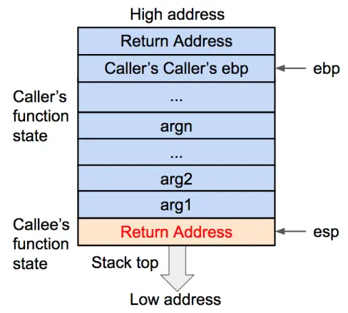 - 然后将基地址内存储的调用函数(caller)的基地址从栈内弹出,并存到 ebp 寄存器内。这样调用函数(caller)的 ebp(基地址)信息得以恢复。此时栈顶会指向返回地址。