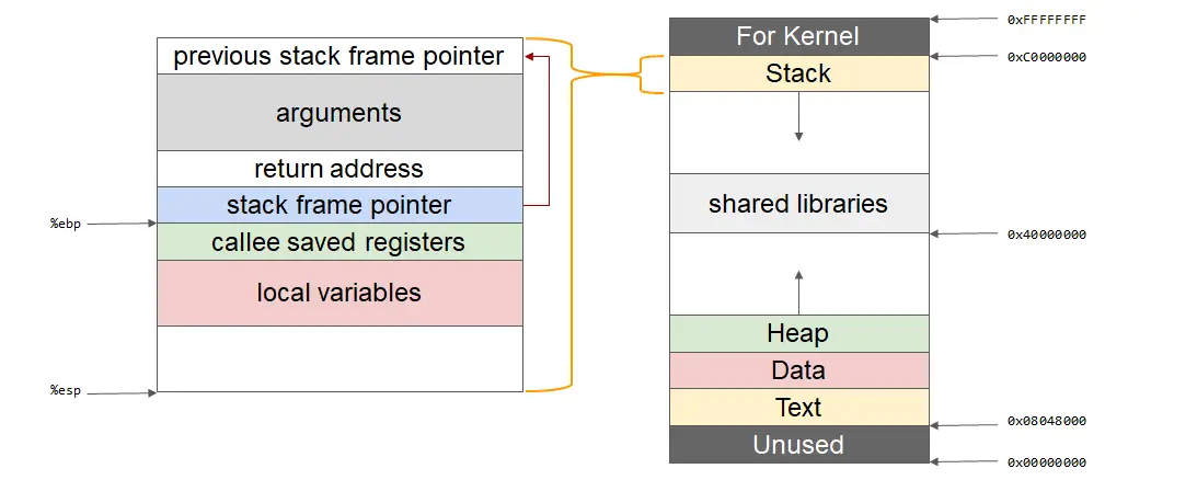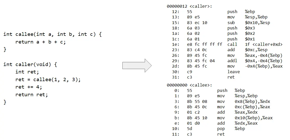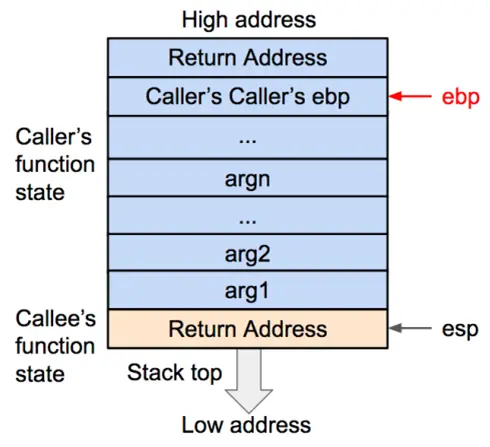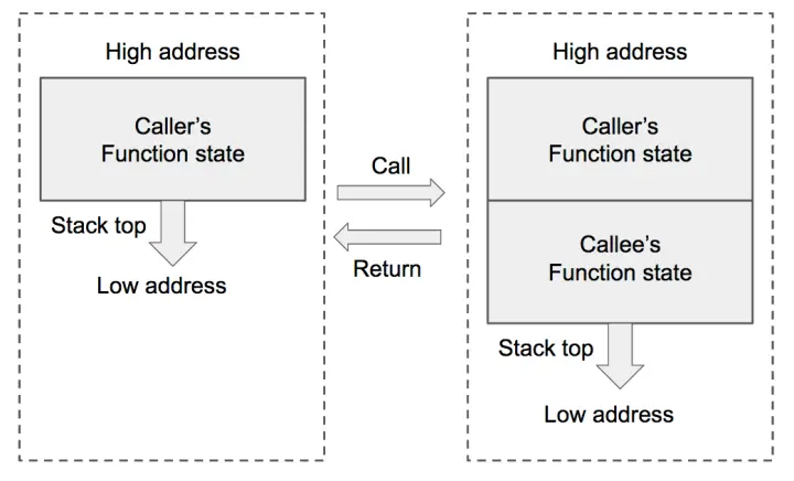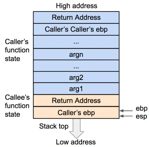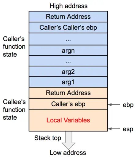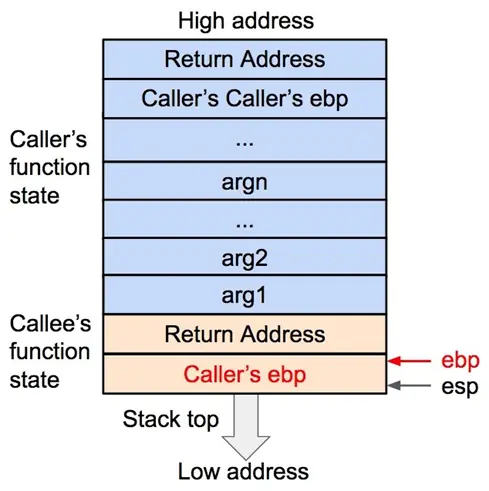 - 在函数调用结束时,栈顶的函数(callee)状态被弹出,栈顶恢复到调用函数(caller)的状态