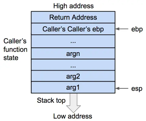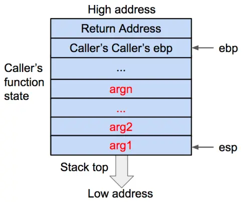 - 首先将被调用函数(callee)的参数按照逆序依次压入栈内。如果被调用函数(callee)不需要参数,则没有这一步骤。这些参数仍会保存在调用函数(caller)的函数状态内,之后压入栈内的数据都会作为被调用函数(callee)的函数状态来保存。