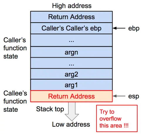 - 先来看看函数调用结束时,如果要让 eip 指向攻击指令,需要哪些准备?首先,在退栈过程中,返回地址会被传给 eip,所以我们只需要让溢出数据用攻击指令的地址来覆盖返回地址就可以了。其次,我们可以在溢出数据内包含一段攻击指令,也可以在内存其他位置寻找可用的攻击指令。