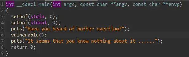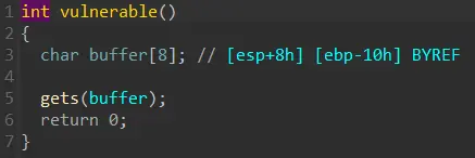 这道题,那么多截图,也就看的很清晰了,main函数里俩puts没啥漏洞,但是留了一个vulnerable函数,进入查看,定义了大小为8的数组,但是gets可以输入任何长度的数据,这里我们将数组到ebp之间都填满,这里其实就包含了数组空间,再把ebp寄存器填满,后满紧跟的就是返回地址空间,将返回地址空间里填入后门函数的地址就好。