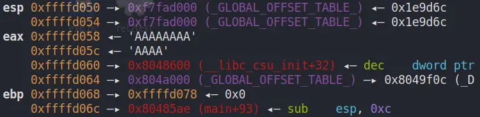- 然后将调用函数(caller)进行调用之后的下一条指令地址作为返回地址压入栈内。这样调用函数(caller)的 eip(指令)信息得以保存。