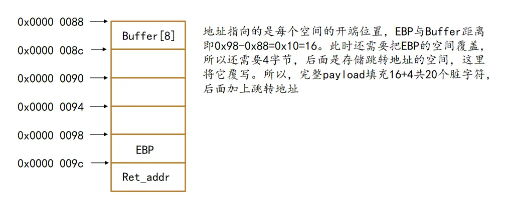 - 篡改栈帧上的返回地址为攻击者手动传入的 shellcode 所在缓冲区地址