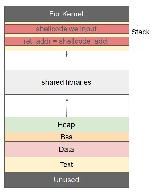 - 目前由于 the NX bits 保护措施的开启,栈缓冲区不可执行,故当下的常用手段变为向 bss 缓冲区写入 shellcode 或向堆缓冲区写入 shellcode 并使用 mprotect 赋予其可执行权限