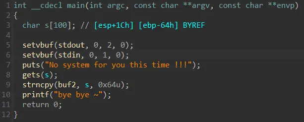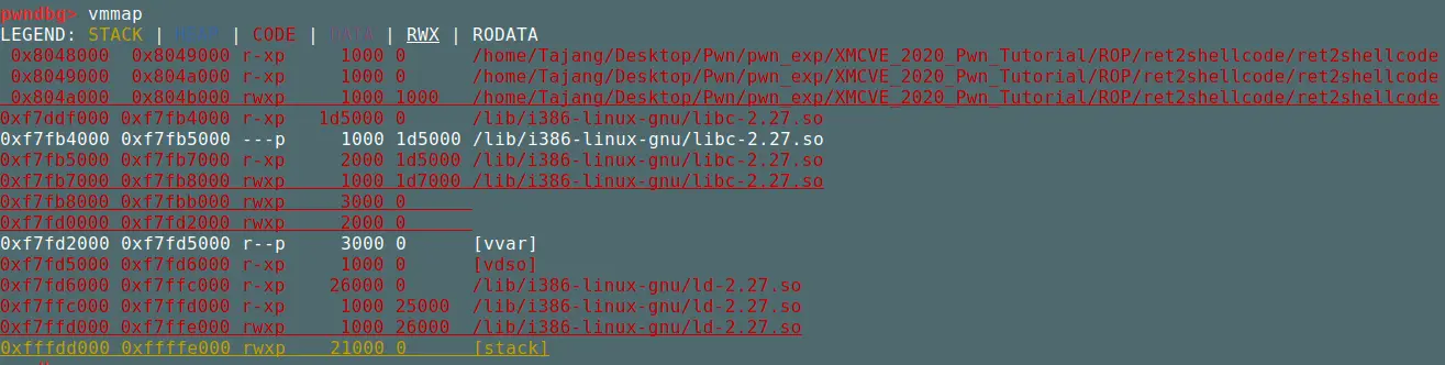vmmap发现,buf2所在的bss段并没有执行权限。原因在更新后的CTFwiki里解释了:需要注意的是,在新版内核当中引入了较为激进的保护策略,程序中通常不再默认有同时具有可写与可执行的段,这使得传统的 ret2shellcode 手法不再能直接完成利用。