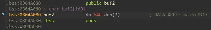 由此可以看出,保护全关,目标机器可能开了ASLR,题目也是让我们调用shellcode,main里将s复制到buf2,显然可以造成溢出,buf2所在段为.bss,查看段权限,此段拥有rwx权限,那我们就可以生成shellcode,以及足够溢出的字符,再加上buf2的地址即可。为什么要这样构造payload?因为在s中输入数据后,即使复制到了buf2,程序也只是将数据复制一份过去而已,并没有运行buf2代码,程序仍然在main里运行着,所以在s里溢出,将跳转位置覆写为buf2地址,这样程序就跳转到了buf2,并且往下执行shellcode。