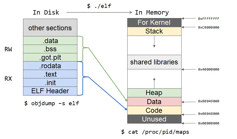 磁盘中的ELF(可执行文件)与内存中的ELF(进程内存映像)
