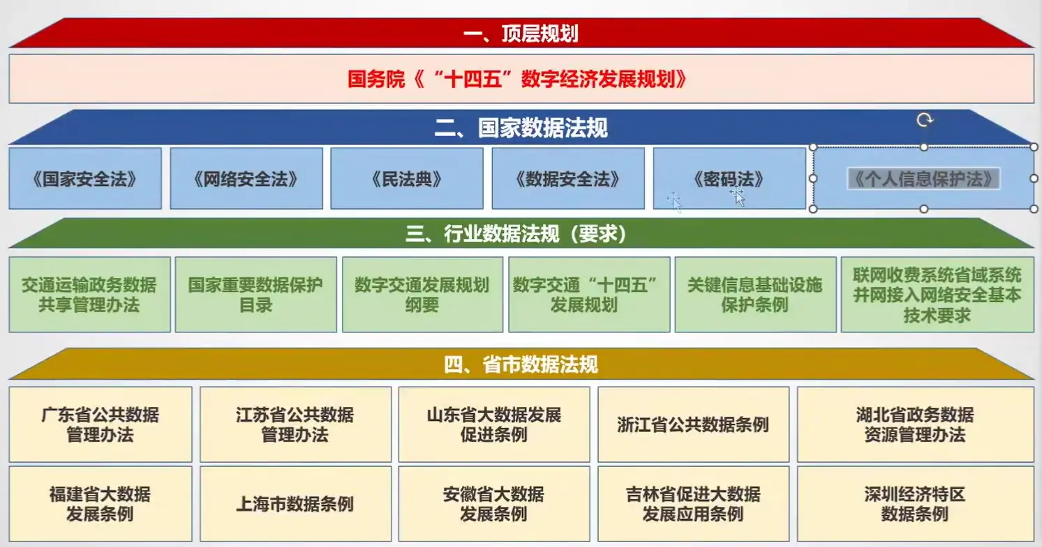 这个是之前给别的公司做的一个,这个就是就是是属于一些商法,像国家安全法啊,国家安全法,民法典网络安全法还有。数据安法包括密码法,保护法这块其实对我们来都是一个上位,就是国家那个层面要去做的一个,包括这个数据安全法,它属于经济信息保护法也经济法,密码法属于行政法,然后数据安全法,网络安全法啊,网络安全法也是经济法,然后宪法这个肯定最高的是国家安全法,然后这个是他们的一个区别,至于具体的你像别的可能就属于下面的这个,你像那个国家法规对吧,顶层规划十四五这个不说,然后国家法规可能就是包含刚才说的这几类,然后他们的一个区别就在于侧重点不一样。你像那个数据安全法,数据安全法其实它很宽泛的,它相当于给了一个框架,我这框架里面包含很多很多东西,但是那个像个人信息保护法,因为那个数据不是就前面提了两类,就是两笼统两大类啊,一个是业务类,一个是个人信息,就是隐私类数据,那数据安全法可能就是针对于个人信息保护法,就针对于数据安全法里面,就是个人隐私个人数据这一块,他再出一个专门针对于它,就是不断细化,不断拆解,不断分解的一个过程。然后的有一些吧,就是各个行业的一个法规,包括一些审视的一个规,这个我觉得就是法律之间的一个一个关系和联系,然后这个的话可以去网上搜一下,你比如数据安全法解析,然后个人信息保护法,就是解读这块就都比较多,就是可以去看一下它这些法律之间的联系和区别。总体来说逻辑是自上而下的。