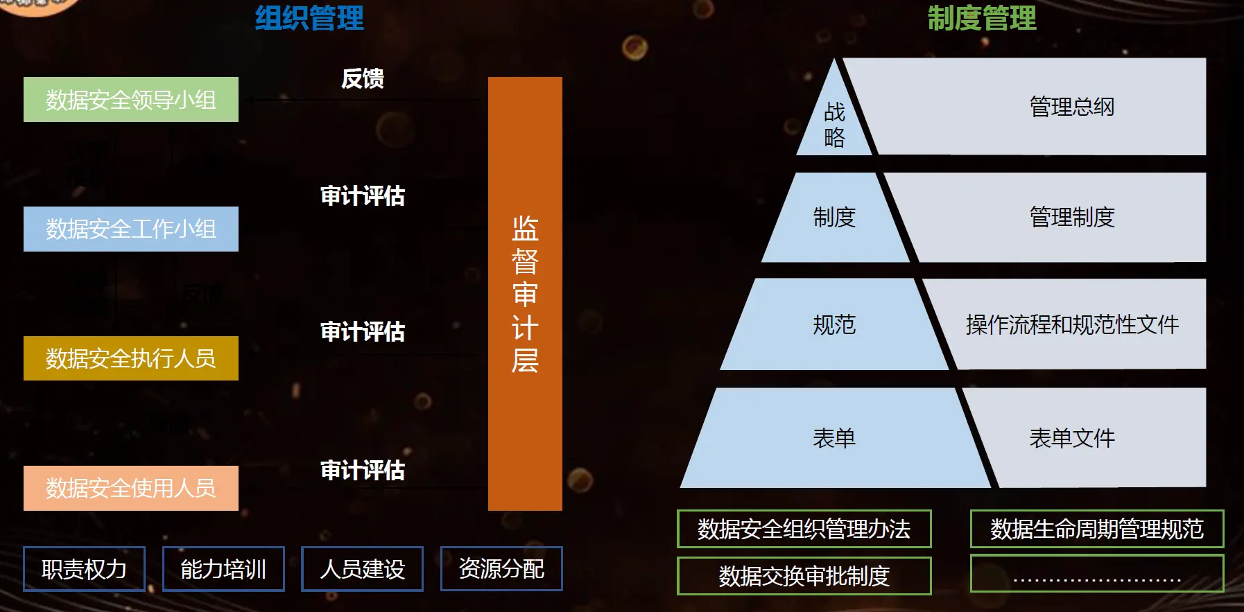 战略、制度、规范、表单,就比如说什么数据安全、生命生命周期管理规范,包括分类分级规范这一块的话,都是咱们要去写的。