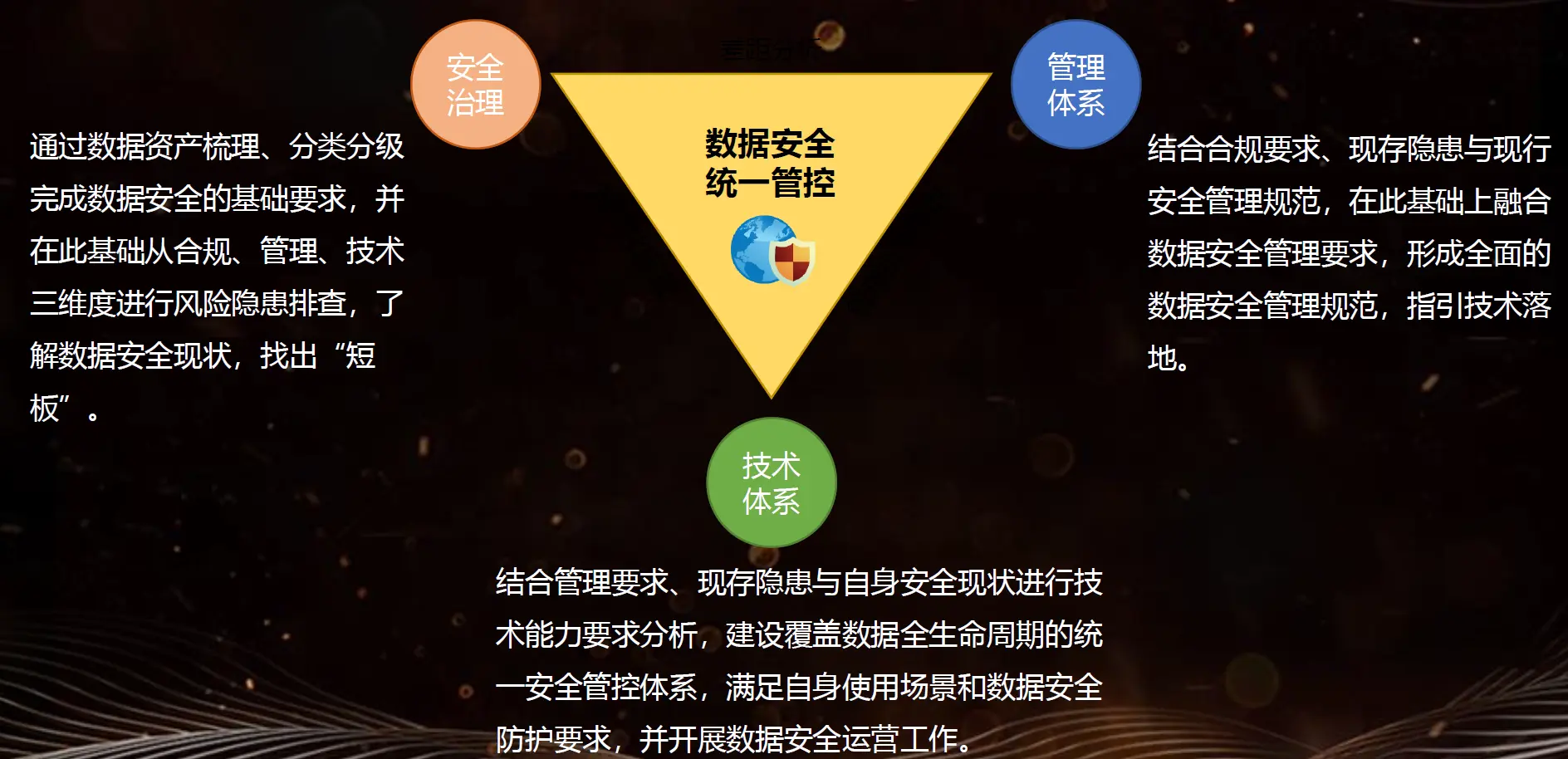 数据安全保护体系其实就是三大块,第一个就是做分类分级,然后做隐患排查,第二个的话就是依托于隐患排查一个结果,找出短板,去做管理体系。一个建设管理体系就是组织架构和那个管理,还有流程这一块,再就是建设技术体系,然后去做这一块的东西