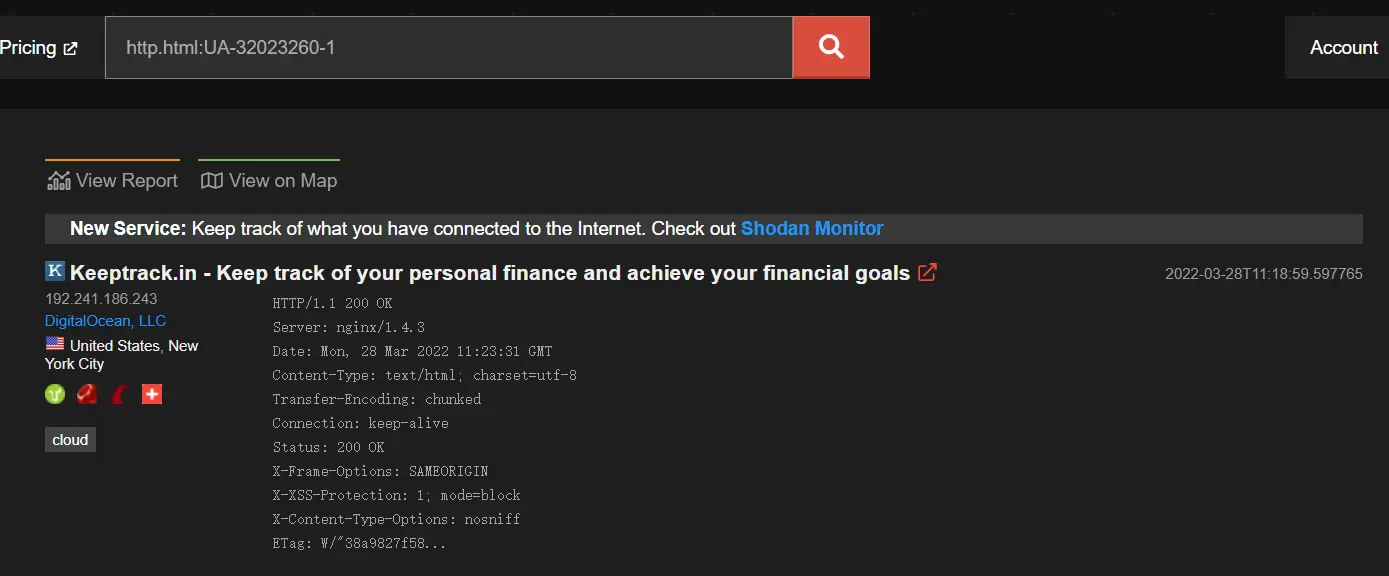 搜索示例:https://www.shodan.io/search?query=http.html%3AUA-32023260-1