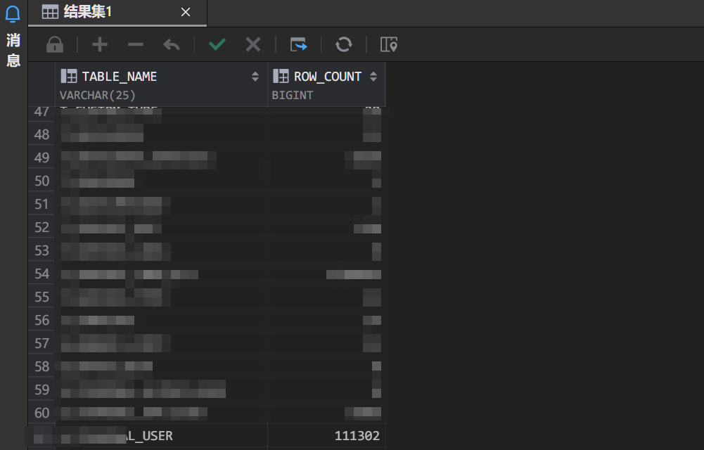某个库里面表太多了,三百多个表,表名很多都是USER结尾,但打开都是空的,但是看数据库体积有很大,想统计每个表数据条数然后,看最多的几个。
