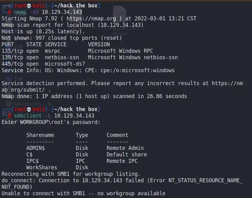 这个是我知识盲区了,smb了解不多,看着YouTube做的。其实百度也能做,nmap探测出smb端口,然后使用smbclient -L列出共享内容