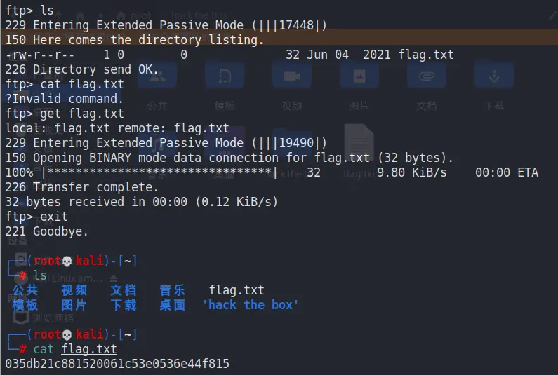 然后ls看到flag.txt,使用get命令下载到本地直接查看就行