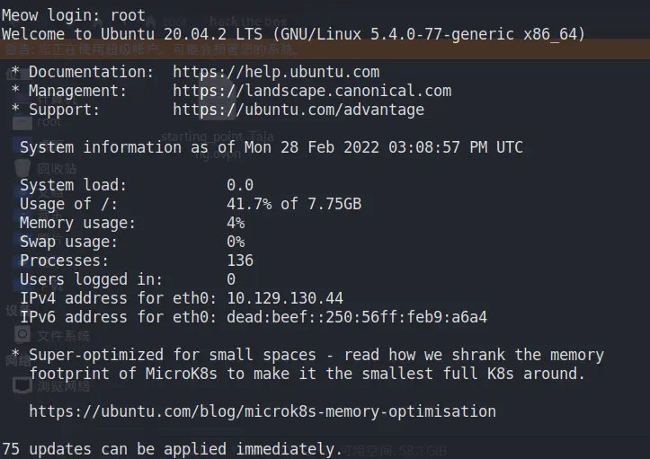 在这里可以看到,telnet是可以连接到的,在通常情况下,需要账户以及密码,但是这个靶机多尝试一些弱口令,比如admin、administrator、root之类的,并且祈祷密码为空,但是前俩需要密码。当我输入root直接登进去了。
